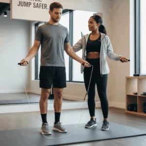 - Choose a forgiving surface: If you can, jump on grass, a gym floor, or a mat.